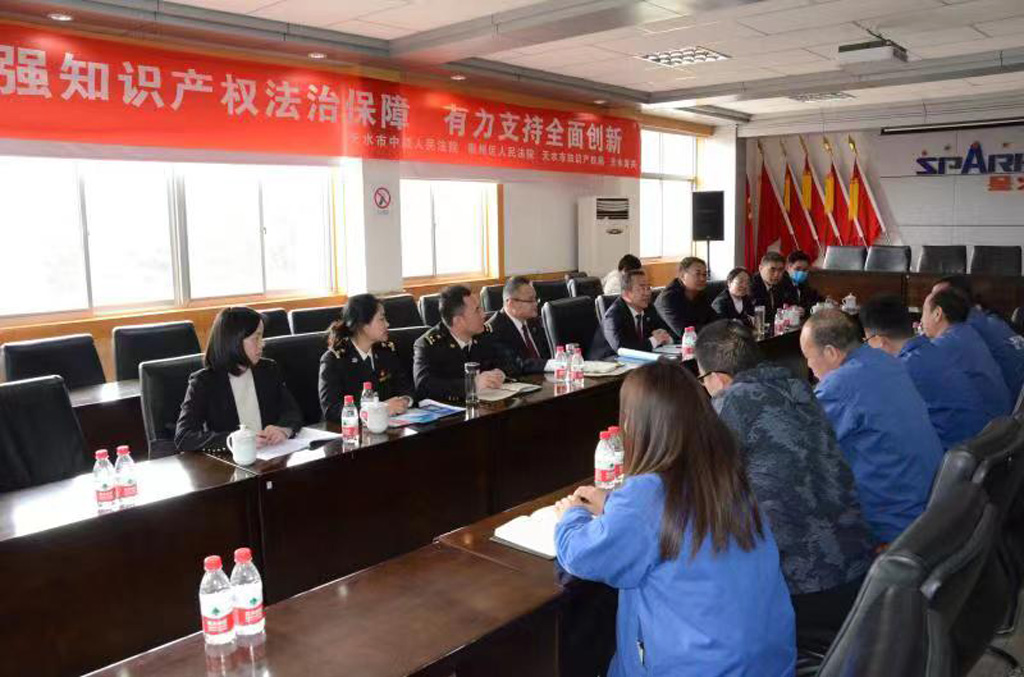 4月24日,以天水市中級人民法院民二庭庭長朱金平為組長,由天水市中級人民法院、秦州區(qū)人民法院、天水市知識產(chǎn)權(quán)局和天水海關(guān)有關(guān)領(lǐng)導(dǎo)和專業(yè)人員組成的服務(wù)組,在星火機床公司開展“加強知識產(chǎn)權(quán)法治保障,有力支持全面創(chuàng)新”為主題優(yōu)化營商環(huán)境、支持企業(yè)全面創(chuàng)新服務(wù)活動,并與企業(yè)相關(guān)業(yè)務(wù)部門負責(zé)人座談。