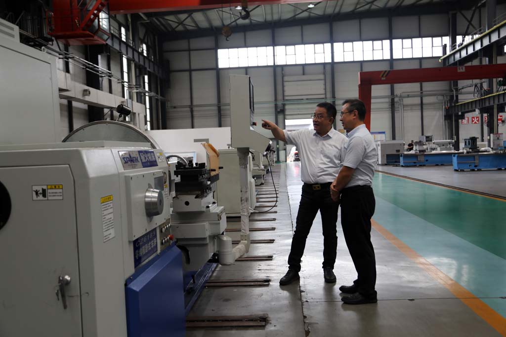 在工業(yè)園生產(chǎn)現(xiàn)場,蔣保權(quán)向姜鑫一行介紹了企業(yè)的歷史沿革,并就企業(yè)發(fā)展現(xiàn)狀、技術(shù)儲備、人才培養(yǎng)等相關(guān)問題以及企業(yè)精細(xì)加工、產(chǎn)品國產(chǎn)化率等進行了交流。蔣保權(quán)結(jié)合現(xiàn)場的各類機床產(chǎn)品及加工設(shè)備,詳細(xì)介紹了企業(yè)技術(shù)研發(fā)、市場拓展、科技成果轉(zhuǎn)化、產(chǎn)業(yè)鏈延伸等情況。