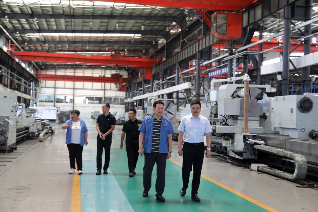 劉勝陪同李濤一行參觀了數(shù)控裝配車間、青重加工車間等生產(chǎn)現(xiàn)場,觀摩了現(xiàn)場陳列的車輪車床、軋輥磨床、臥式車床等產(chǎn)品。劉勝結(jié)合現(xiàn)場產(chǎn)品講解了各產(chǎn)品的性能特點及技術(shù)參數(shù),并向來訪客人介紹了企業(yè)科技創(chuàng)新、產(chǎn)品研發(fā)以及人才培養(yǎng)方面的相關(guān)情況。