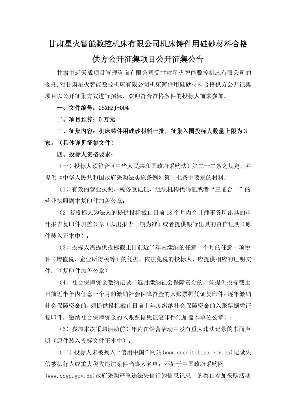 甘肅星火智能數(shù)控機床有限公司機床鑄件用硅砂材料合格供方公開征集項目公開征集公告