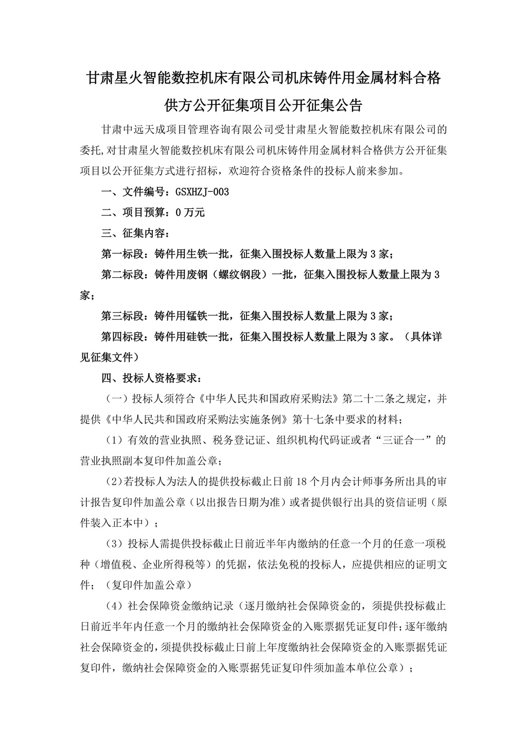 甘肅星火智能數(shù)控機床有限公司機床鑄件用金屬材料合格供方公開征集項目公開征集公告