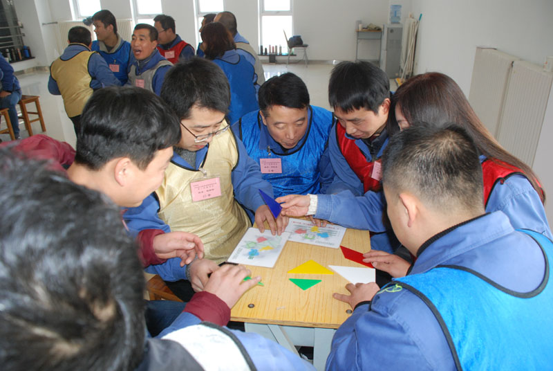 根據(jù)老師的要求,50名隊(duì)員按1——4循環(huán)報(bào)數(shù),分為4組,分別穿好紅、黃、藍(lán)、銀色馬夾后,開始了熱身游戲。在模擬企業(yè)7個(gè)部門的梅花型沙盤演練中,全體隊(duì)員分為7個(gè)小組,以七巧板為道具,按任務(wù)書要求必須在最短的時(shí)間內(nèi)完成各自的任務(wù)?;顒?dòng)旨在考察并訓(xùn)練大家的溝通、協(xié)調(diào)領(lǐng)導(dǎo)能力,以及團(tuán)隊(duì)意識(shí)。此時(shí)已臨近中午,董事長(zhǎng)蔣保權(quán)在觀看了活動(dòng)后講話,闡述了團(tuán)隊(duì)及領(lǐng)導(dǎo)的重要性。