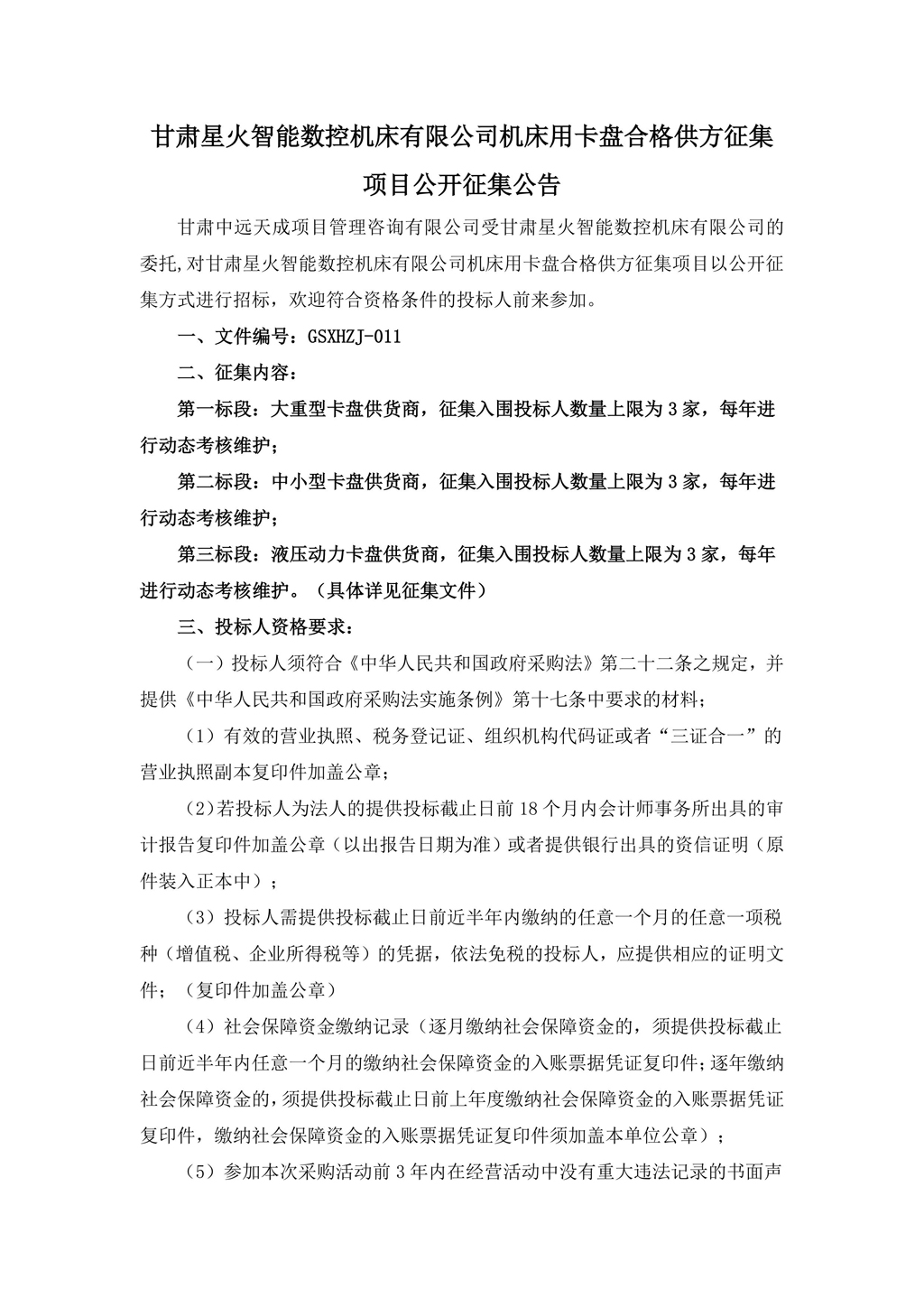 甘肅星火智能數(shù)控機床有限公司機床用卡盤合格供方征集項目公開征集公告